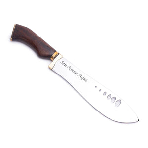Cabo em Madeira de Imbuia e Detalhes em Bronze: O cabo de madeira de imbuia oferece não apenas um design elegante, mas também uma pegada firme e confortável. Complementado por uma guarda e um pomo em bronze, a faca ganha um toque de requinte e resistência adicional.